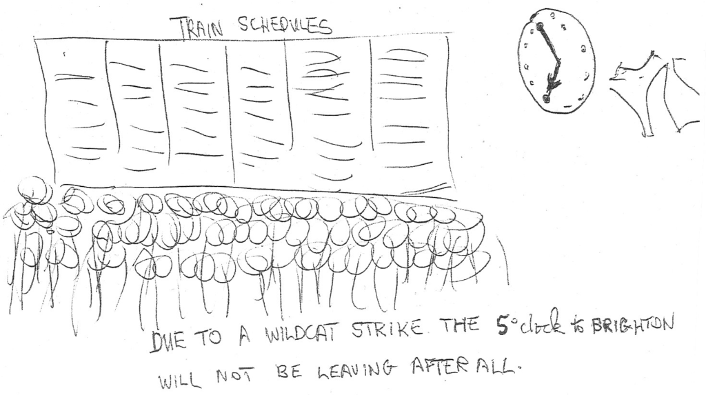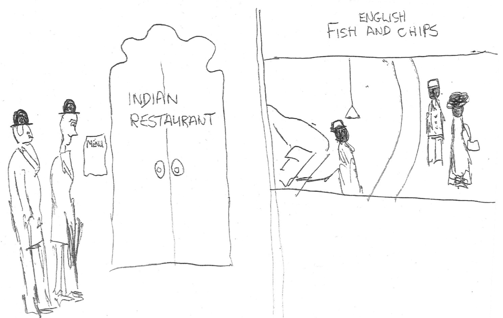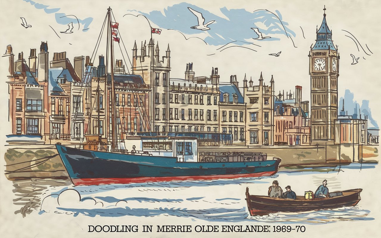 During my time in England, trying to find a full time career in book publishing, I came up against the country of my childhood, holding on stubbornly to its past while it struggled with a new reality. I was an unemployed stranger, a North American interloper trying in vain to be English again. The times had changed since my departure in 1956 and the England of the late 1960s had become a challenge to my future possibilities, ever changing: changed. Because I didn’t fit in anymore I began to doodle away my uncertainties with a pen and a cryptic view of what I saw in the new England.